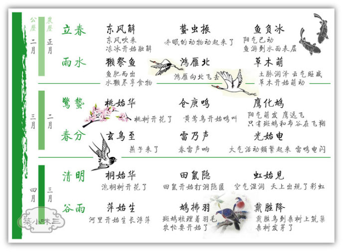 立春:立春之日东风解冻,又五日蛰虫始振,又五日鱼上冰(鱼陟负冰)。雨水:雨水之日獭祭鱼,又五日鸿雁来(候雁北),又五日草木萌动。