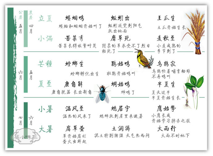 小满:小满之日苦菜秀,又五日靡草死,又五日小暑至(麦秋生)。