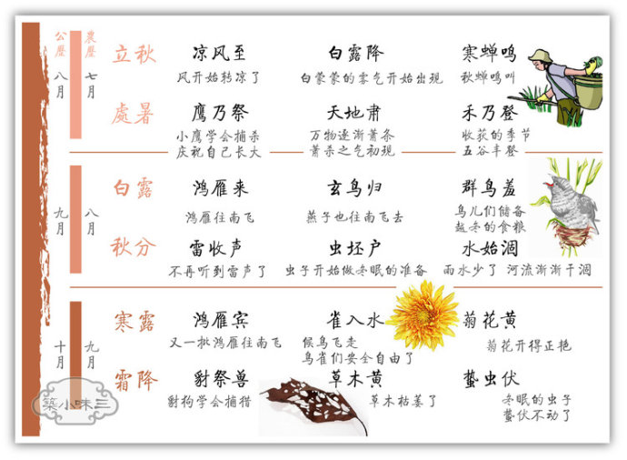 白露:白露之日鸿雁来,又五日玄鸟归,又五日群鸟养羞。