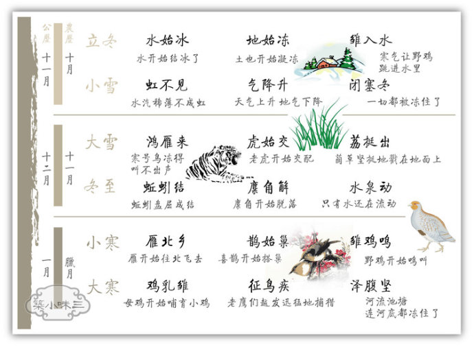 小寒:小寒之日雁北乡,又五日鹊始巢,又五日雉始雊。