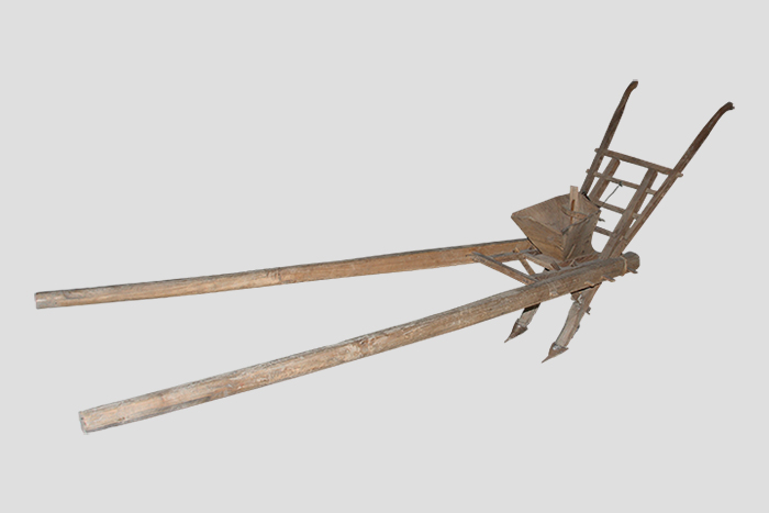 藏品-传统农具-播种移栽工具-二脚耧河北省白洋淀 辕长217厘米 耧脚宽30厘米 耧架高130厘米