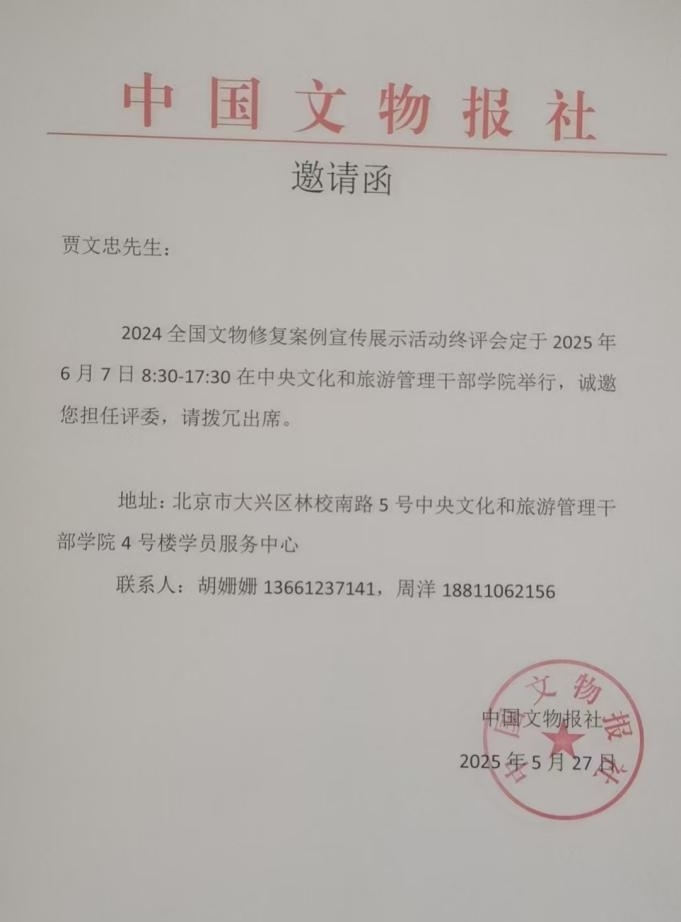 6月7日,文物修复鉴定专家、中国农业博物馆研究馆员贾文忠受邀作为评议委员会专家,出席“2024全国文物修复案例宣传展示活动”终评会,听取项目代表汇报并评议。