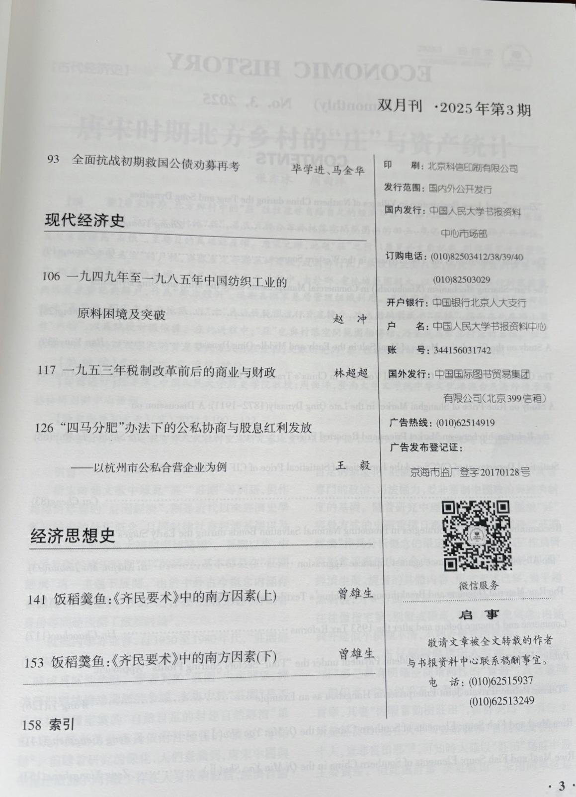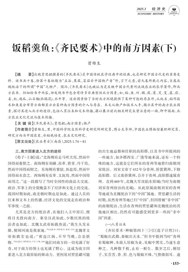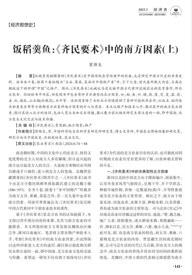 近日,中国农业博物馆特聘专家曾雄生独撰论文《饭稻羹鱼:〈齐民要术〉中的南方因素》被人大复印报刊资料《经济史》2025年第3期全文转载。原文3万余字,分上下篇,分别发表于《农业考古》2024年第6期和2025年第1期,这样大篇幅地被人大复印报刊资料全文转载,凸显出论文的思想深度和学术影响。