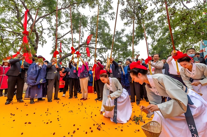 每年的秋分节气,在稷山县贡枣园举行秋分板枣开杆仪式。随着富有仪式感的鼓号响起,古装仪仗队护送“杆王”从豳风门进入人们视线。通过敬献五谷、敬诵祝文等环节,表达对先人的纪念、对大自然的尊重、对收获的渴望、对幸福生活的憧憬。