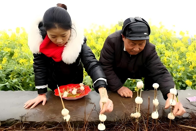 广东等地会把一些实心的汤圆用细竹叉扦着置于田边地坎,称作“粘雀子嘴”,免得鸟雀来破坏庄稼。