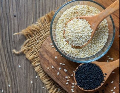芝麻,古称胡麻、巨胜、方茎等。我国种植和食用芝麻的历史可追溯至先秦时期,至汉代已较为普遍。北魏贾思勰在《齐民要术》中除系统总结黄河中下游地区芝麻栽培技术外,还记载了用芝麻榨油、制作“胡麻羹”。芝麻籽粒细小,颜色多样,常见的有黑芝麻、白芝麻,可直接食用、榨取香油,也能磨成粉制作芝麻酱、芝麻糊、糕点等。芝麻富含不饱和脂肪酸、蛋白质、维生素 E、钙、铁等营养成分,具有补肝肾、益精血、润肠燥的功效,对秋季出现的须发早白、头晕眼花、肠燥便秘等有一定缓解作用。地标产品有项城白芝麻、瑞昌黑芝麻等。