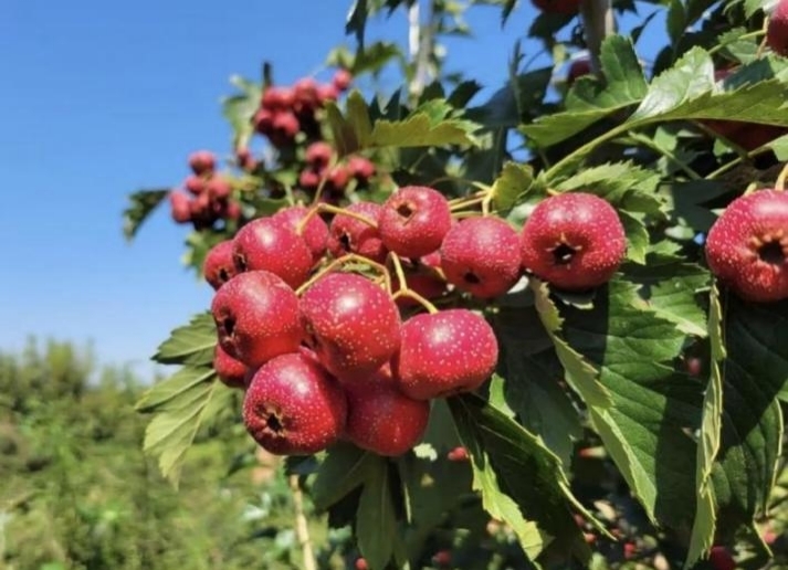 山楂,古名朹,今俗名山里红、红果等,在寒露时挂满枝头。2000多年前,山楂就被中国先民作为充饥野果。唐宋时期,山楂成为民间交易、馈赠佳品,常现“山童负担卖红果”的场景。山楂果实小巧红艳,味道酸甜可口,可鲜食,但更多用于加工成果酱、果糕、糖葫芦等。山楂也可入药,元代吴瑞所著《日用本草》指出其有“化食积,行结气,健胃宽膈,消血痞气块”的功效。现代研究表明,山楂富含山楂酸、黄酮类物质,能促进消化、降血脂。地标产品有辉县山楂、七里坡山楂等。
