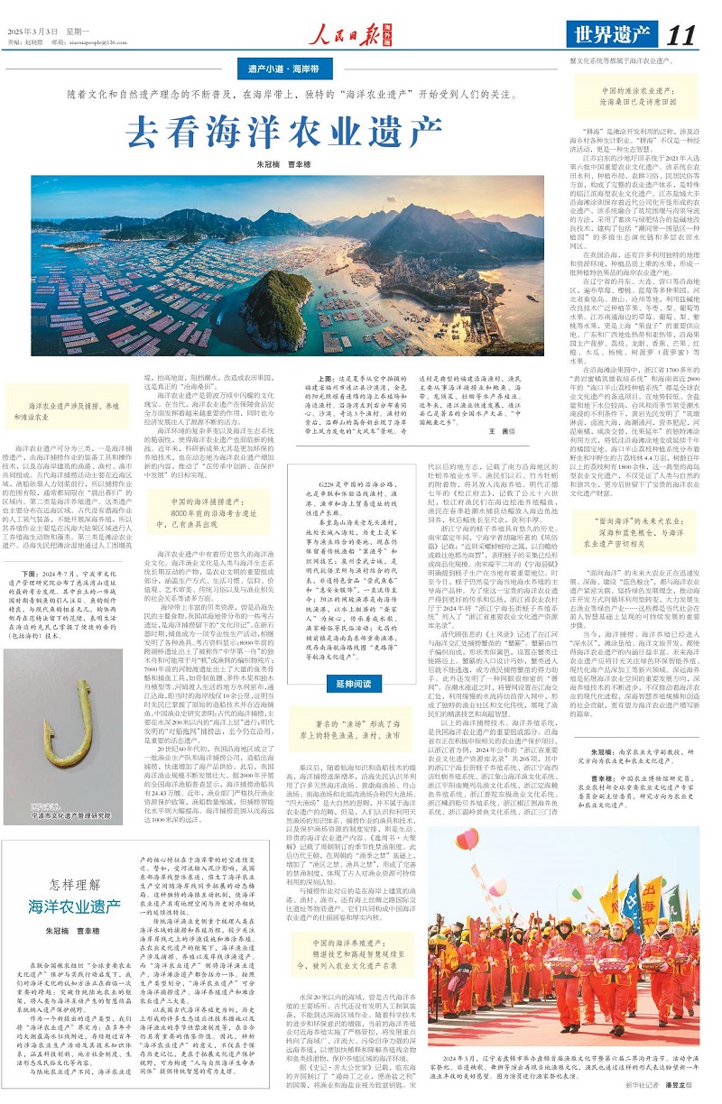 随着文化和自然遗产理念的不断普及,在海岸带上,独特的“海洋农业遗产”开始受到人们的关注。3月3日,人民日报海外版11版刊载中国农业博物馆研究员曹幸穗署名文章《去看海洋农业遗产》。