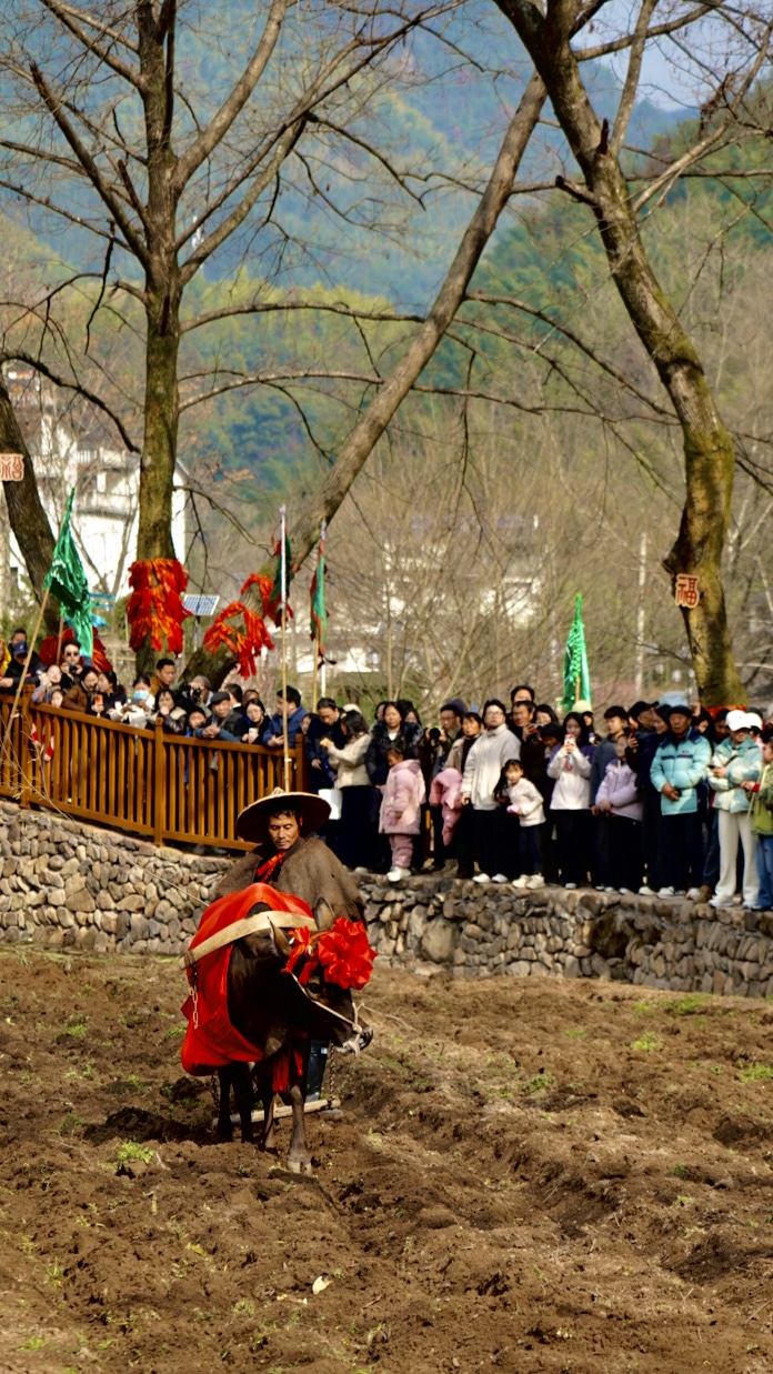 此时,立春主题曲《在衢州,打开中国的春天》悠然响起。司农引导老农、牧童与抬“春牛”队伍从梧桐祖殿走向司农田。田埂四周早已聚满人群,目光聚焦于扬鞭的牧童。“一鞭春牛、春回大地,二鞭春牛、风调雨顺,三鞭春牛、三阳开泰……”清亮的《鞭春喝彩歌》响起,犁头破土,种子入地,将仪式推向高潮。