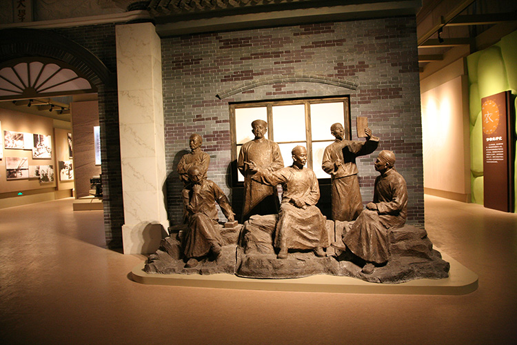 一走进四号馆西厅,观众就可以看到一组人物雕塑,雕塑中的6位历史人物都是中国近代农业变革的先驱。他们中有“ 开眼看世界”的代表人物魏源,撰写的《海国图志》使当时的中国人看到了一个新奇、陌生的世界;中国第一报人王韬,他以超前的历史眼光,建议晚清政府购买西方纺织机器和农业机具,“以兴织纴(纺织)、以便工作、以利耕播”; 改良主义思想家郑观应,所著《盛世危言》,提议“参仿西法”,引进西方农业科技,提出选派留学生等;撰写《适可斋纪言》的马建忠建议“访求西法,师其所长”,以改良中国农业;维新派的骨干人物陈炽,他的《庸书》指出:西方国家“农事有书,植物有学,更进化分土质,审别粗细,故能百产蕃昌,亩收十倍”;近代著名的实业家、教育家张謇,主张“实业救国”,一生创办了许多棉纺企业和农业学校,对推动近代农业科技进步和应用作出了积极贡献。此外,这里还展出了“公车上书”和“明定国是”诏书,正是因为这两个诏书的颁布,推动了近代农业科学技术迅速进入中国,促进了中国农业科学技术的转变,传统农业开始向近代农业转化。